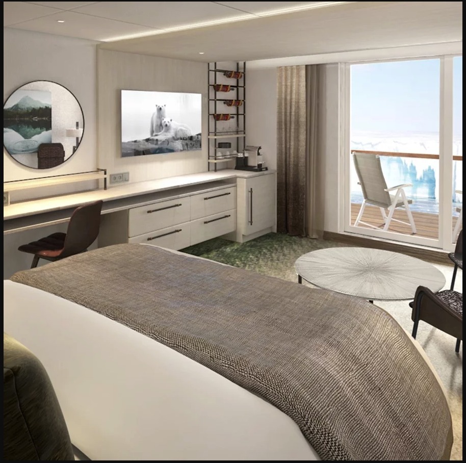 These suites are large, well-appointed cabins with expansive windows and most have balconies. Some have private outside jacuzzi. The suites feature flexible sleeping arrangements with comfortable sofas, sitting areas and TV. Expedition suites are exclusively in upper and mid-deck locations. Our Expedition Suite concept includes an amenity kit, bathrobe, espresso maker, and more. Can accommodate up to four passengers.