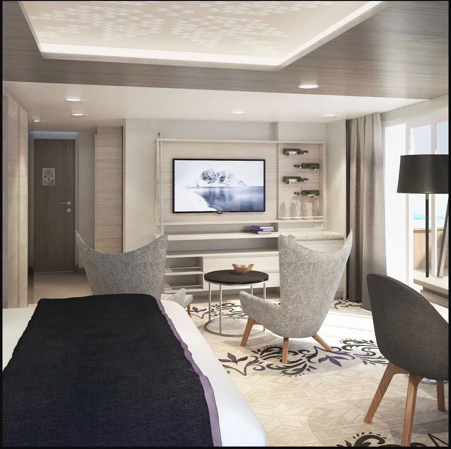 Large Corner Suite with private balcony, flexible sleeping arrangements, sofabed, TV, minibar, bathrobe, kettle, espresso maker. Adapted for guests with wheelchair.Please note: This cabin is automatically made with a double bed. To order twin beds, please notify us at time of booking.